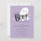 Este adorável convite apresenta fantasmas bonitos colocados num fundo roxo. As palavras "Um Pequeno Boo Bonito Está Quase Vindo" são escritas em letra divertida e festiva. É a maneira perfeita de anunciar a chegada do seu pequeno e deixar seus convidados saberem que estão em uma celebração macabra. Certamente será um sucesso para todos que o receberem.