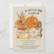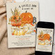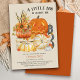 Um pequeno boo está quase a chegar - convite para o chá de fraldas de Halloween. Design de aquarela russa em cor neutra do gênero, cores ricas do outono de laranja queimada, ouro amarelo e cinza. A ilustração apresenta uma abóbora laranja com girassóis, jack ou lanterna e abóboras brancas em uma caixa de madeira de fazenda, decorada com folhas de outono e placa de varanda BOO.