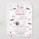 Celebre sua mãe para ser com este Chá de fraldas de Halloween Rosa, com um doce fantasma, abóboras cor-de-rosa e morcegos brancos. Este convite é perfeito para um chá de fraldas de outono ou outubro com um toque suave e fofo assustador.