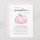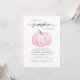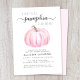 Um convite de chá para uma menina de outono fofo que apresenta "A Sweet Little Pumpkin Is On Her Way" na tipografia de cinzas e um roteiro de na moda, e uma aquarela rosa de uma abóbora. Personalize o nome da mãe e os detalhes do chá em simples tipografia.