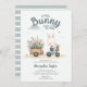 Uma ilustração encantadora de aquarela com um coelho precioso cavalgando um triciclo e puxando um vagão de flores silvestres decora este delicado convite para o chá de um bebê com um esquema de cores azul, verde e branco, que é um ajustado perfeito para uma celebração da primavera, eventos de Páscoa, um fête do jardim de verão ou um charmoso chá de fraldas de piquenique.