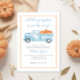 Um pouco de abóbora está no caminho que o chá de fraldas convida com abóbora aquosa e xadrez azul pastel. Tema do Chá de fraldas de outono.
