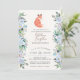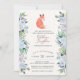 Uma doce raposa vermelha olha sobre o ombro dele neste belo convite inspirado na natureza. Bordas de peônias, rosas, flores silvestres, bagas e florestas verdes correm pelas bordas com o texto anunciando seu Chá de fraldas no meio. Um design simples, delicadamente rendido em lindas cores naturais de verde, azul-céu, lilás, turquesa e laranja. Azul no lado oposto.