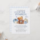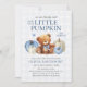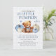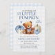Celebra a mãe para estar com este pequeno convite de Chá de fraldas de Gingham Fall Boy Blue Pumpkin. Apresentando um doce ursinho de pelúcia, abóboras aquáticas, fundo de gingham azul bebê e tons de outono aconchegantes, este design boho traz um toque doce e rústico para sua celebração. Perfeito para um chá de fraldas de menino "Podemos Esperar" ou cair em um borrão de bebês, este convite editável é fácil de personalizar e impressão.