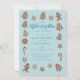 Cartões de convite para chás de fraldas de Natal fantástico e doce, com ilustração desenhada à mão de biscoitos de férias. O texto diz "o nosso biscoito está a caminho." O fundo é azul e é perfeito para um chá de fraldas de menino.