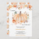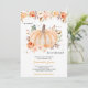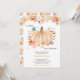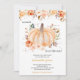 Celebre o seu pequeno com este encantador Convite para Chás de fraldas de Abóbora. Apresentando uma abóbora doce no centro, lindamente adornada com rosas delicadas e folhas de outono ouro, esta design radiante elegância rústica. A borda de cima é graciosamente alinhada com flores de aquarelas moles, acrescentando um toque suave de calor e branco. Ideal para um chá de menina, este convite dá o tom perfeito para uma celebração sentida e sazonal. BBS846