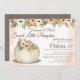 Chá de fraldas doce de abóbora, abóbora branca bonito com madeira floral cor de laranja claro e de celeiro rústico atrás do convite do chá de fraldas. Queda do convite ao chá de fraldas neutro em termos de gênero.