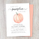 Um convite de chá de fraldas neutro em outono, com "A Sweet Little Pumpkin Is On Your Way", na tipografia das cinzas, com hastes, e uma bonita cor de água laranja pastel de uma abóbora. Personalize o nome da mãe e os detalhes do chá em uma simples tipografia de cinza. Especificar o sexo do bebê, se desejado (por exemplo, "está a caminho").