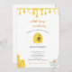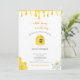 Convide os convidados para o chá de fraldas temático das abelhas com este convite com uma linda abelha de mel espreitando para fora de uma bifurcação, com pingos de mel no topo do convite, e bezerros e ornamentos florais nos cantos inferiores. O texto diz que "um pouco de mel está a caminho" com uma letra decorativa.