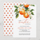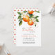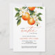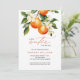 Little Cutie Orange Clementine Chá de fraldas Invitation apresenta um belo buquê de laranjas aquáticas e flores junto com elegante tipo de caligrafia.