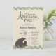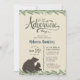Barato personalizado de convites para chuveiros para bebês personalizados com os detalhes da sua festa. Esta design rústica fofa apresenta uma mãe e um bebê urso com uma fronteira de folha de madeira. Uma bela tipografia escrita à mão diz "Deixe a Aventura Começar". O lado inverso tem um impressão botânico de coordenação com detalhes de chá de fraldas de longa distância ou usa o espaço para outras informações de convidado. Use as ferramentas de design para personalizar o texto, editar as fontes e as cores ou adicionar suas próprias fotos para criar um convite exclusivo de chá de fraldas rústico de bosques.