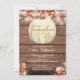 Um convite de chá de fraldas super fofo com luzes bonito de cordas, folhas florais rústicas e abóbora personalizado com seus detalhes especiais definidos em tipografia elegante em um fundo de painéis de madeira. Projetado por Thisnotme©