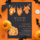 Ilustrações bonitinhas e bonitinhas e sem sexo, ilustrações do Pequeno Boo Halloween chá de fraldas convite de festas com roupas cor de laranja, perfeito chá de fraldas de Halloween, com ilustrações bonitinhas adoráveis de laranja com abóboras, fantasmas, morcegos e buquês de girassóis, flores laranja, abóboras brancas e laranja no escuro. Um pequeno boo está a caminho! Um chá de fraldas de Halloween não assustador