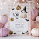 Um pequeno Boo está prestes a chegar! Convite para chás de fraldas temático do Halloween com abóboras bonitinhas, morcegos e fantasmas em um fundo laranja de gingham. O perfeito design de Chá de fraldas do templo halloween!