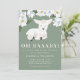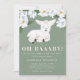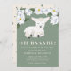 Carteira de modelo de convite para chá de fraldas, com um tema simples e neutro em termos de gênero, apresentando uma ilustração de uma ovelha bebê, que sorri doce no rosto. Há flores brancas de magnólia no topo. Este convite de cor verde é excelente para meninas e meninos. O texto diz "OH BAAABY! Um cordeiro está a caminho."