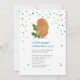 Tema do chá de fraldas de nugget de frango com aquarela inspirada na ilustração de um núgulo com folhas de arugula. O texto azul diz, "um pouco de nugget estará aqui em breve" cercado por confetti. o verso é azul.