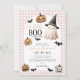 Um pequeno Boo está prestes a chegar! Convite para chás de fraldas temático do Halloween com abóboras bonitinhas, morcegos e fantasmas em fundo rosa de gingham. O perfeito design de Chá de fraldas do templo halloween!