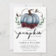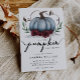Cartão de modelo de convite para chá de fraldas doce com uma abóbora azul com falso brilho prateado, folhas verdes e flores de burgundy. O texto da tipografia diz "Um pouco de abóbora está a caminho." Tema perfeito para o chá de um menino no outono.