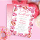 Sabemos que não pode esperar para ver sua "Querida Pequena Querida" e esta design Virtual de Chá de fraldas com tema doce celebra você e sua pequena em delícia! Uma deliciosa trama de padaria e um quadro cor-de-rosa doce rodeia os detalhes do seu chá de uma forma tão elegante. A parte de trás apresenta uma espiral de algodão doce para cima desta design mais doce do que doce.