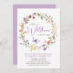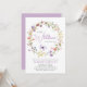 Um convite para chás elegante para uma menina que apresenta "uma pequena flor selvagem está a caminho" escrito numa mistura de tipografia moderna das cinzas moles e uma escrita roxa na moda, e aquarelas inspiradas em ventre de uma coroa de flores roxas, rosa, pêssego e amarelas e de uma borboleta roxa. Personalize o nome da mãe e os detalhes do chá em lavanda simples e tipografia de cinza.
