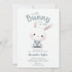 Uma ilustração encantadora de aquarela com um coelho precioso vestindo macacões decora este delicado convite para o chá de um bebê com um esquema de cor azul e branco empoeirado, que é um ajustado perfeito para uma celebração na primavera, eventos de Páscoa, um fête no jardim de verão ou um agradável chá de fraldas de piquenique.