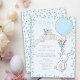 Um coelhinho está a caminho... um convite para chá de fraldas de menino bonitinho com uma paleta azul gentil. O design é emoldurado por flores azuis e apresenta um belo coelhinho com um pequeno buquê e um balão azul voando uma faixa, amarrado com chá de fraldas, e decorado com um passarinho. O verso do convite tem o mesmo padrão floral caprichoso. Perfeito para um chá de fraldas, verão, páscoa ou tema de coelho.