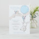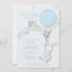 Um coelhinho está a caminho... um belo convite para o bebê borrifador com uma delicada paleta azul. A design apresenta um belo coelhinho com um pequeno buquê e um balão azul voando em uma faixa, com a inscrição de um bebê, e decorado com um passarinho. A parte de trás do convite tem um padrão floral peculiar. Perfeito para um chá de fraldas, verão, páscoa ou tema de coelho.