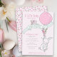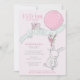 Um coelhinho está a caminho... um convite de bebê bonitinho com cor rosa e verde-menta. A design apresenta um belo coelhinho com um pequeno buquê e um balão cor-de-rosa voando um banner verde da casa da moeda, marcado com o borrifo do bebê, e decorado com um passarinho. A parte de trás do convite tem um padrão floral peculiar. Perfeito para um chá de fraldas, verão, giro, páscoa ou tema de coelho.