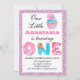 Garota e doce Cupcake roxo, lilás roxa, primeiro convite de aniversário com rosquinha e doces. Adicione facilmente o nome do cheio e a data, hora e endereço da festa de aniversário. Perfeito para uma doce princesa virar uma!