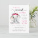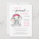 Um belo convite para chás de uma menina que apresenta "Our Sweet Little Peanut Is On Her Way" escrito em uma mistura de tipografia e roteiro modernos de cor rosa e cinza mole, e uma aquarela de um elefante de uma menina com uma coroa de flores rosa na cabeça. Personalize facilmente os nomes do bebê e da mãe em tipografia rosa e os detalhes do chá em simples tipografia de cinzas moderna