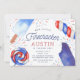 Convites de festas adoráveis para a sua festa de aniversário de verão apresentam quatro ilustrações de picolé de cor d'água em tons clássicos de vermelho, branco e azul, pontilhados com fogos de água correspondentes. "Nosso fogos de artifício está girando [idade]" aparece no centro, com seus detalhes de festa de aniversário embaixo. Uma paleta festiva de cor patriótica torna este convite perfeito para aniversários que chegam perto de 4 de julho, Dia do Trabalho ou outras férias de verão.