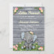Este adorável convite apresenta um elefante de amendoim com orelhas azuis xadrezes e cachecol com flores coloridas em um pano de fundo de madeira rústica de cinza.