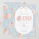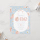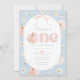 Uma abóbora fofa! Abóbora Floral e arco Chamada de primeiro aniversario da menina com fundo azul e rosa com margaridas, abóbora e arco rosa fofo.
