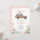 Convite para chá de fraldas de menina no outono, com ilustração de um SUV cor-de-rosa e madeira tocado com abóboras e cercado por confetti. O lado oposto é gingham rosa.