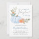 Um bonito e fofo convite para o chá de um bebê que apresenta "uma doce abóbora está a caminho" escrito numa mistura de tipografia azul e um roteiro de cinzas moles na moda com um inchaço cardíaco, e um buquê de aquarela de uma abóbora azul pastel, florais laranja e verde. Personalize o nome da mãe em um roteiro azul moderno e os detalhes do chá em uma simples tipografia de cinzas suaves.