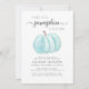 Um convite para o chá de um bebê de outono bonito, com "A Sweet Little Pumpkin Is On Your Way" escrito em tipografia de cinza e um roteiro de na moda, e uma aquarela azul pastel de uma abóbora. Personalize o nome da mãe e os detalhes do chá em simples tipografia.