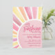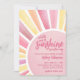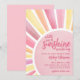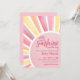Um raio de sol está a caminho! Celebre a chegada iminente com este convite de chá de bebê temático de sol, macio e alegre. Um grande sol pastel preenche o design, apresentando um centro rosa com raios coordenados suaves para um visual doce e radiante. O texto do evento é centralizado dentro do sol em fontes rosa escuro, misturando estilos modernos e clássicos para um visual sofisticado e divertido.