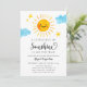 Cartão de convite de chá de fraldas bonito com ilustração aquosa de um sol sorridente com estrelas e nuvens. O texto diz "Um pequeno raio de sol está a caminho". Design neutro em termos de gênero.