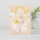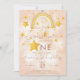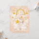 Convite de primeiro aniversário boêmio arco-íris em rosa suave, poeira mágica e estrelas douradas brilhantes. Clique no botão "personalizar mais" se desejar reorganizar e formatar o estilo e a colocação do texto.