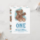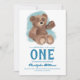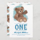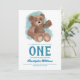 anuncie e convide pessoas para comemorar seu bebê fofo que está prestes a virar um com aquele belo ursinho de pelúcia e a tipografia azul especial e o padrão atrás.