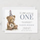 Nosso filhote de urso está fazendo um primeiro convite de aniversário para bebês. Matizes azuis e marrons. Bear no chapéu de festa. Bonito aquarelas brancas brancas, que são excelentes de convites neutros em relação a gênero para rapazes e raparigas. As costas têm um padrão de chapéu de festa em rosa e azul. Moderno estilo animal rústico da floresta. Whimsical e fofo.
