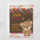Ursinho de peluche e convites de aniversário de bolinhas coloridas.
