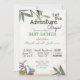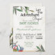 Deixe a Adventure Begin Book Request Chá de fraldas - uma diversão misturou o convite para chás de fraldas de tipografia pedindo livros em vez de presentes, apresenta livros de aquarela e folhas botânicas e verde.