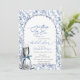 Este convite elegante apresenta um charmoso arco azul, pérolas e prosecco, e flores azuis em um fundo branco perfeito para um chá de panela "algo azul". Esses convites de chá de panela são facilmente personalizados para o seu evento simplesmente adicionando seus detalhes. Os intrincados motivos florais e matizes azuis macios sussurram de algo antigo, algo novo, e claro, algo azul.