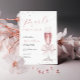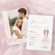 Este convite elegante apresenta um copo de champanhe cor-de-rosa adornado com um arco e pérolas cor-de-rosa, com uma foto personalizável da noiva ou casal no verso. Perfeito para um brunch bridal moderno ou brunch e celebração à bolha, o design de aquarela e os elementos de gema chic adicionam um toque de sofisticação. Adicione os detalhes do evento para criar um convite exclusivo e memorável.