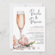 Um elegante chá de panela com um roteiro de fontes que diz "pérolas e prosecco", vidro prosecco de cor d'água alto com pérolas, e sotaques de flores contra fundo branco. Personalizar com detalhes de celebração.
