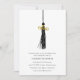 Cartão de modelo de convite para festa de formatura moderna com ilustração de uma fita preta com um símbolo de folha de ouro falso pendurado da palavra "FORMANDO". Personalize com seu texto na frente e adicione a foto do formando na parte traseira da placa ou remova a foto e mantenha-a simples e moderna. Excelente para segundo grau e formando universitário. Arte original ©Marisu Valencia