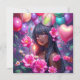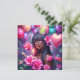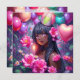 Bonito convite personalizado de aniversariante. Gráficos bonitos de uma linda anime com pele mais escura e olhos roxos e cabelos cercados por balões e flores cor-de-rosa. Estas são bonitas para uma adolescente ou pré-adolescente.