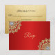 Elegantes cartões de resposta de casamento RSVP vermelhos indianos modernos e tradicionais. A cor do fundo pode ser alterada. Bela flor Mandala com design dourado e diamante. Verso com folha dourada falsa. Modelos editáveis - adicione seu texto. Contate o designer para outras variações.