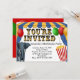 Carnaval de circo Cheer Custom Invtions, Grande design com tenda de circo, elefante, pipoca e balões em verde brilhante, vermelho, amarelo e azul. Personalize com as informações da sua parte. Faz um excelente, convite de festas único para o aniversariante, garota, ou qualquer ocasião! Design divertida com informações sobre a festa.